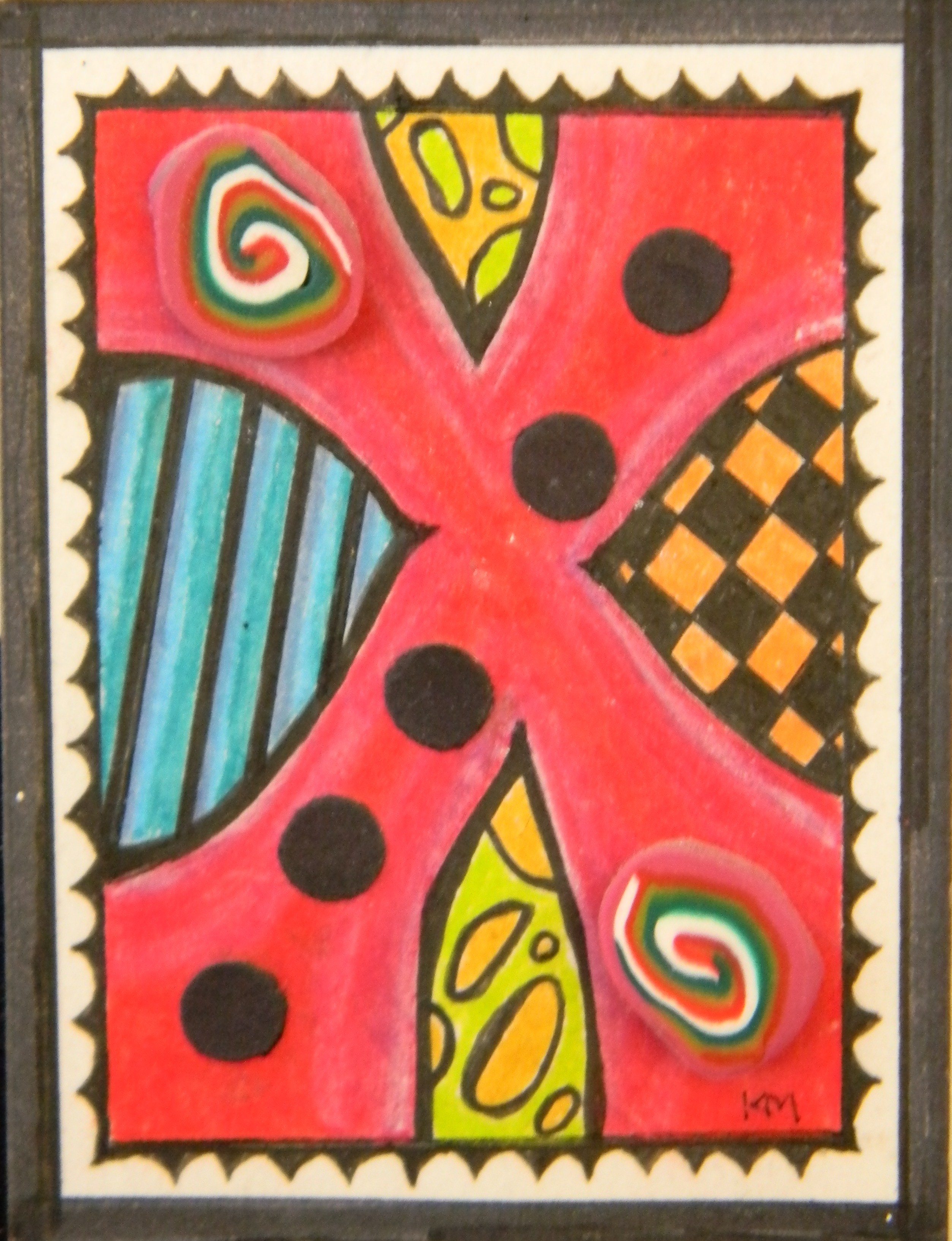 The next small piece is also ink, color pencil, and polymer clay. In it you can see a closer shot of the beads, these made using the same technique as described above. These particular beads were, in fact, sliced cross-sections from the same rolled snake of clay.