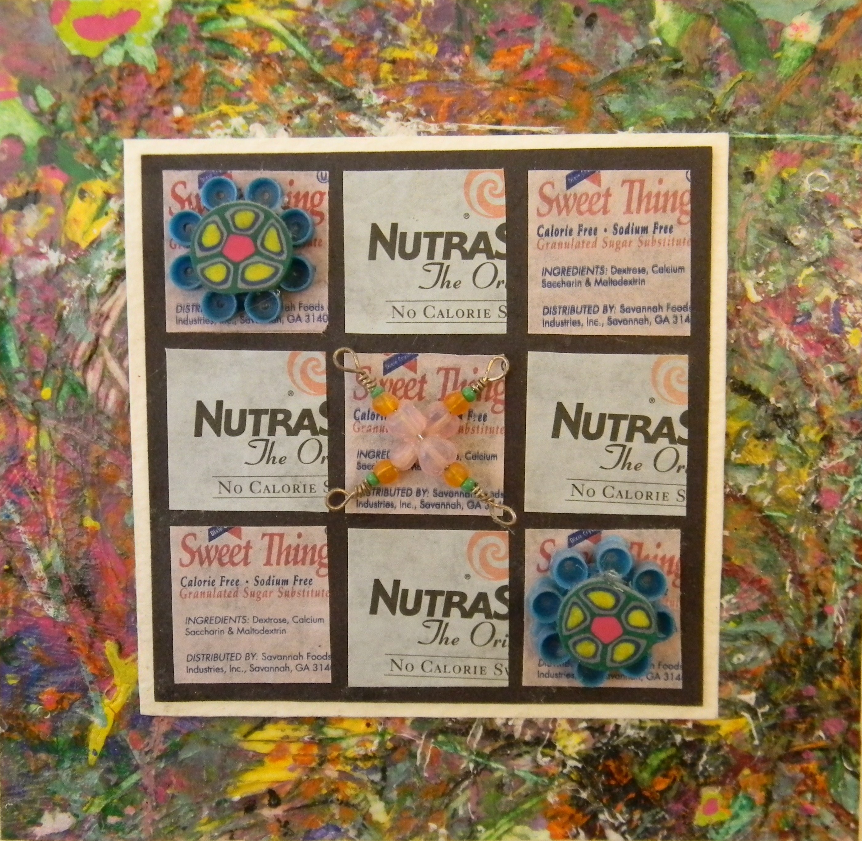 The last mixed-media piece was created in several parts. The background is tempera paint that I applied to watercolor paper and then blew with a hairdryer to mix and create texture. Since tempera paint is flat and not very durable, I applied a layer of high gloss polyurethane to both preserve the paint and create a more reflective surface. On top of that background, I glued smaller pieces of white and black craft paper, to which I then added the pink and blue squares that were cut from empty packets of Equal and Sweet ‘N Low (a generic version). In the upper left and lower right hand corners are the O’s of the tic-tac-toe game. The blue plastic base is a recycled cap from my nephew’s cap gun, to which I have added another polymer clay bead. The X in the center is made from pink, orange, and green beads on sterling silver wire.