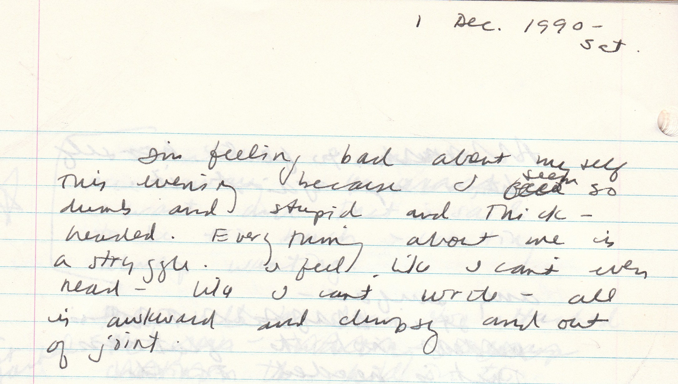 And not being able to follow a conversational thread isolated me socially—as did my sudden removal from the workplace. I describe how this all affected my self-esteem in a journal entry from December 1, 1990: