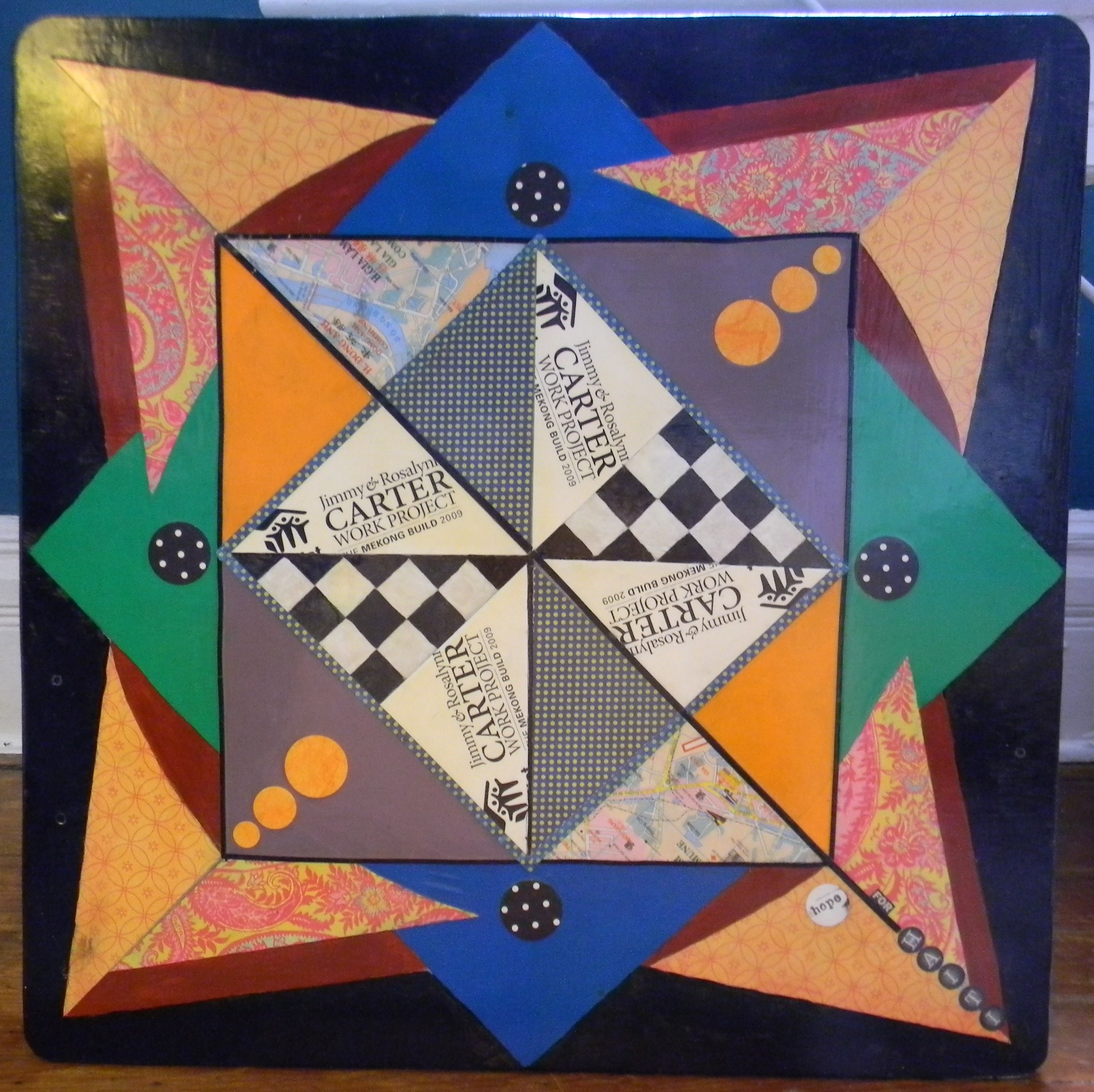 After lots of paint and even more found paper, including a map of Hanoi and left-over invitations to a reception with Jimmy and Rosalynn Carter, the table now looks like this: