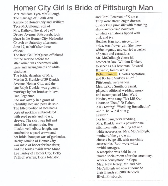 Though my mother told me last week she knew nothing about this aspect of Daddy’s “business” before they married and only came to realize gradually during their first year of marriage, I also discovered from reading their marriage announcement published in the Indiana Gazette that the man who is currently, 50 years later, the underboss of the Pittsburgh crime family was in my parent’s wedding party.  The text of that announcement is reproduced below.  (To read the original and see a photo of my mom in her wedding dress, click here.)