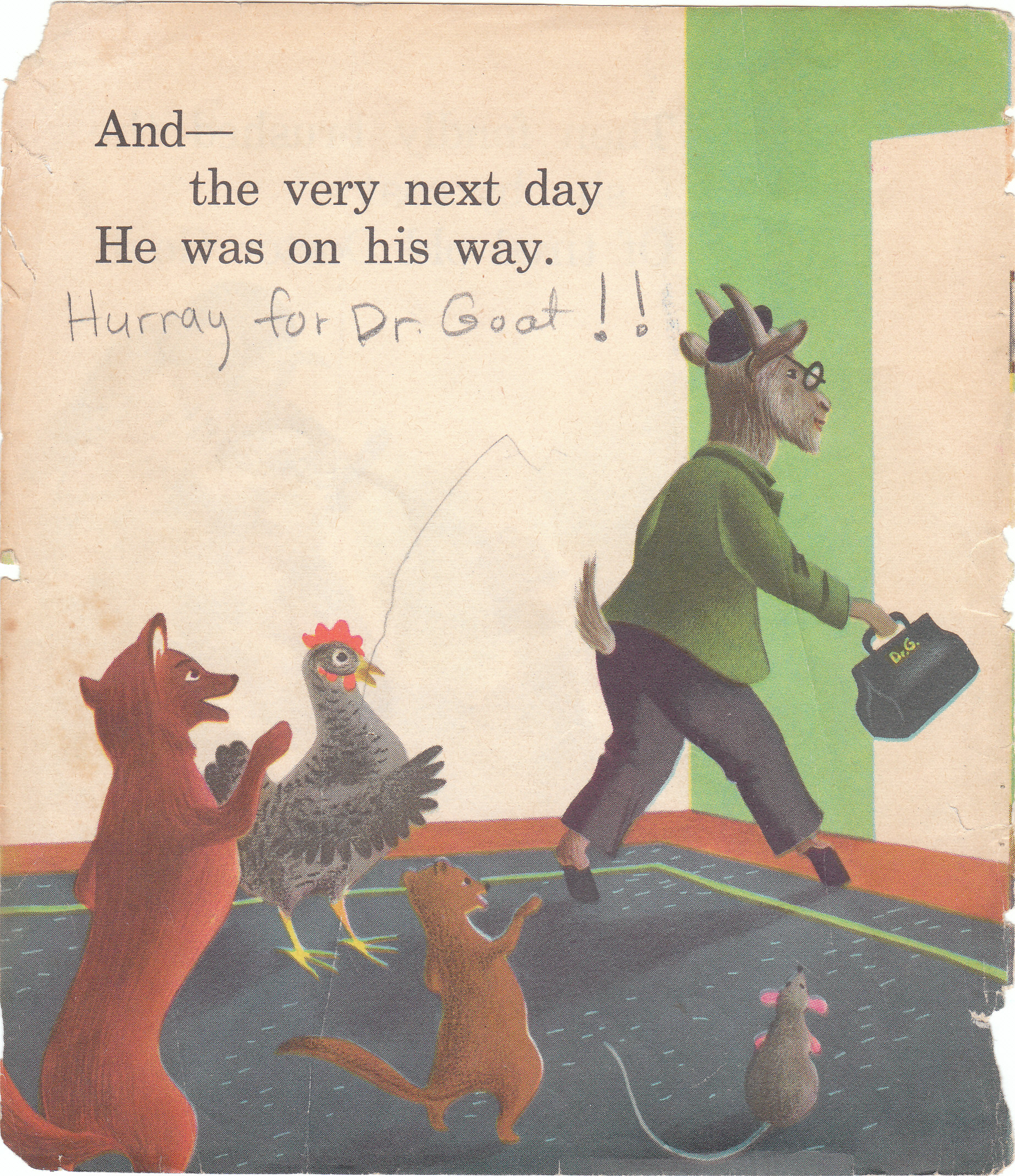 I should have commented on my mother’s penciling in “Hooray for Dr. Goat.” We read the book so much that the last page fell out–and that’s what the missing page said.