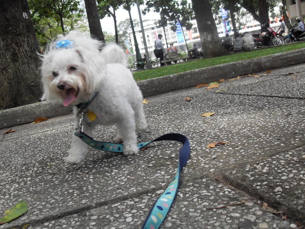 However, day-to-day living with Lucy in Vietnam proved more challenging, since, for the first several days, I couldn’t locate a blade of grass within a 10 block radius of our apartment. There was a park a 15 minute walk away, but it was so far that even getting there involved rehydration stops along the way: