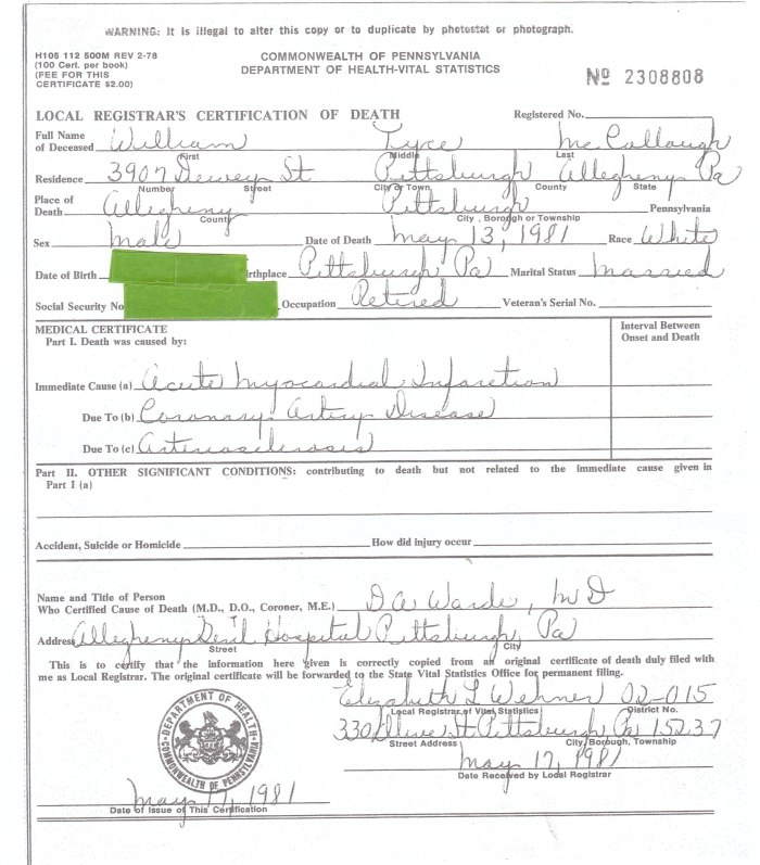 The Freedom of Information Act assures my access to it, as long as I have the appropriate supporting documents. But in order to qualify, I have to prove my dad is, indeed, deceased. Acquiring either my father’s social security number in order to file for a copy of the death certificate with the State of Pennsylvania myself, or acquiring a copy already in my mother’s possession, have both required my mom’s cooperation. And due to no small miracle, she has come through. She gave me a copy of both my dad’s social security number and a copy of the death certificate on Friday. I can begin applying for the FBI file this week.