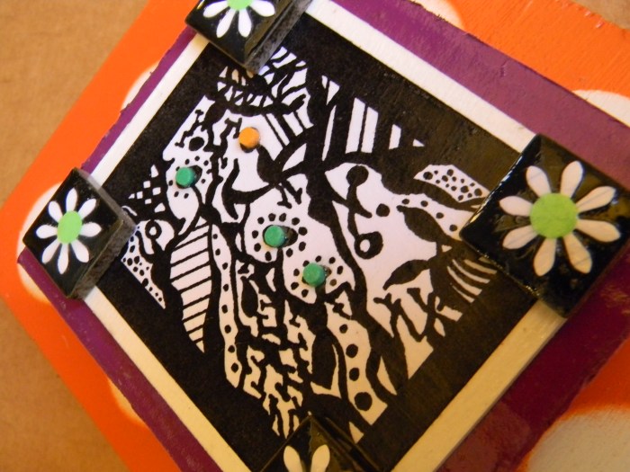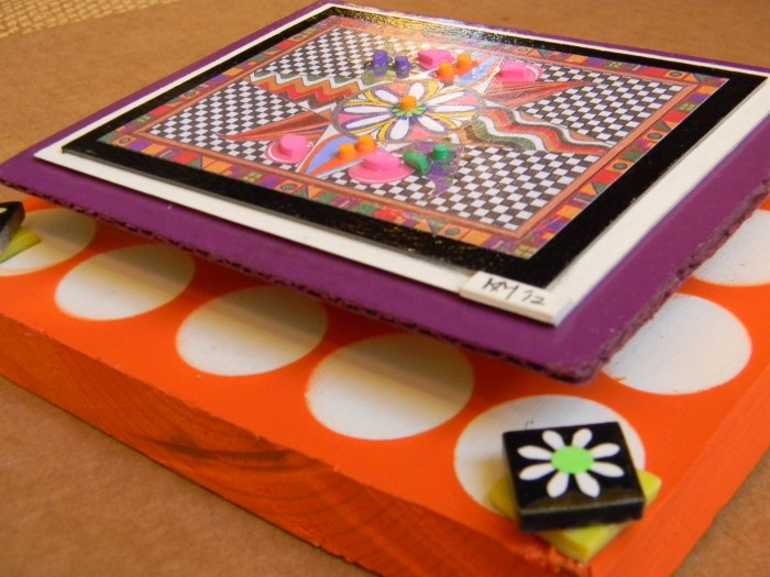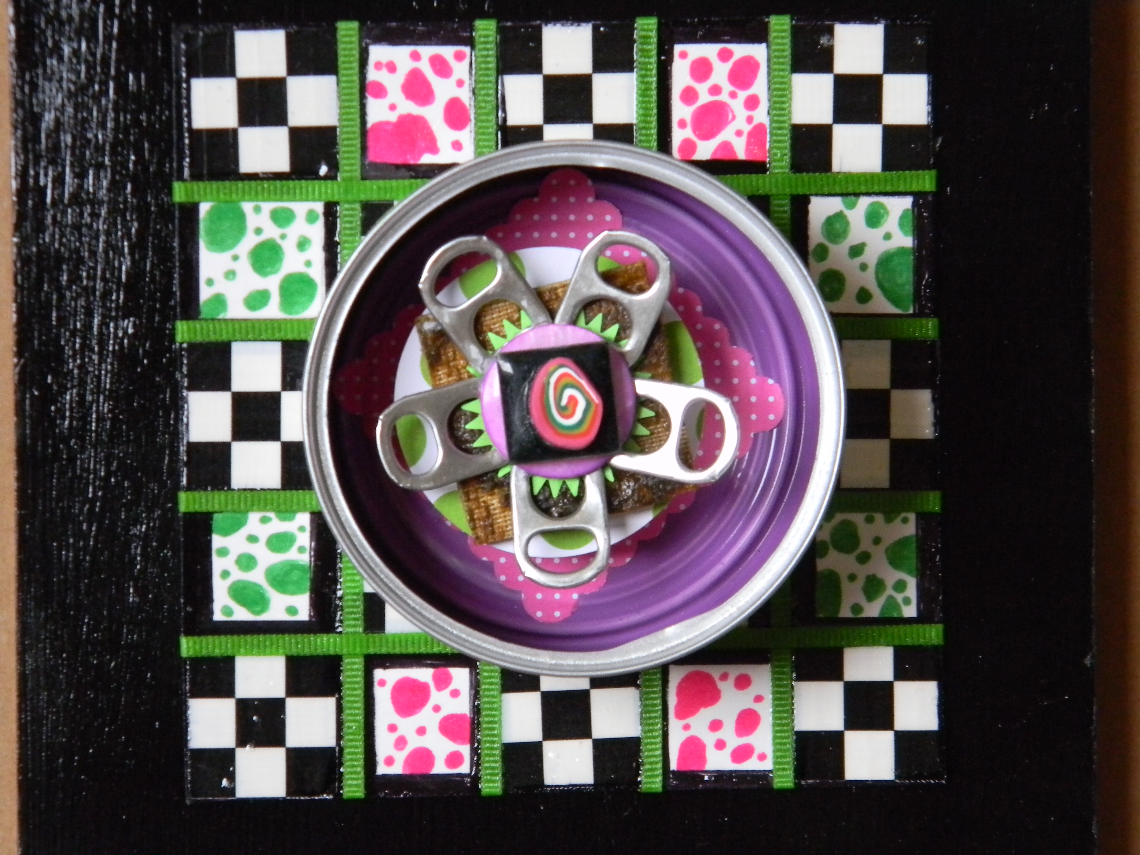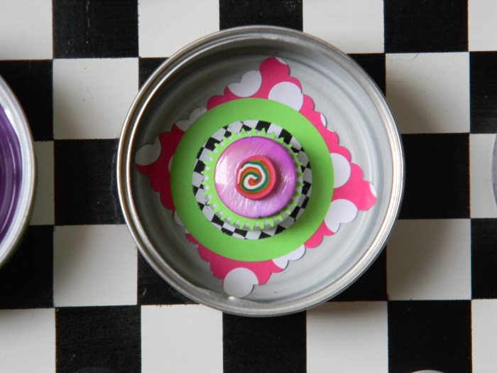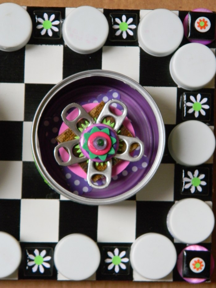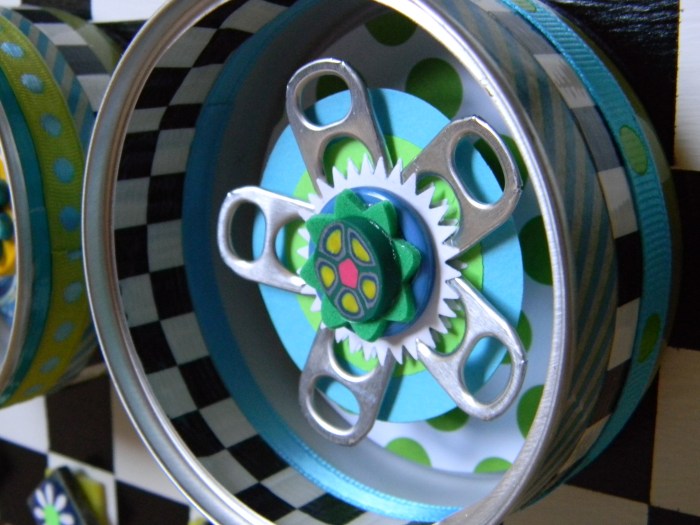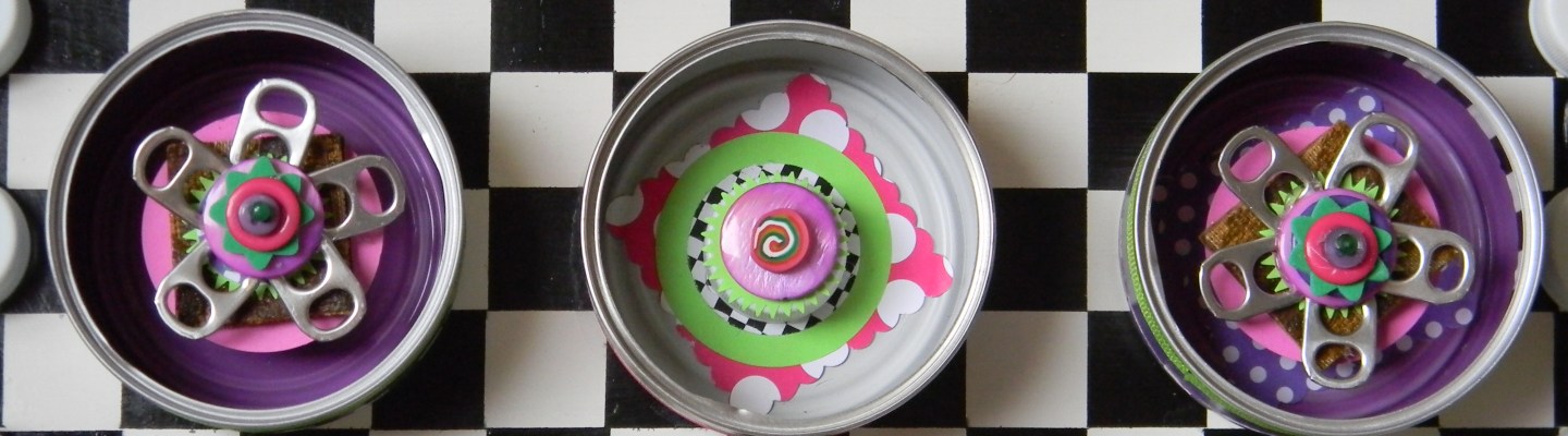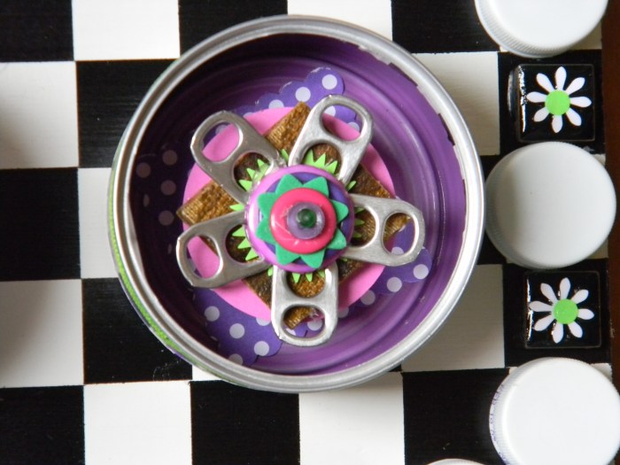 But you should decide for yourselves.  Has my creation of art become as extreme as Sara’s palette preference?  Do I need to slow down, get some rest, read a few blogs, maybe even leave a comment or two?  Has my morphing of things as ordinary as empty cat food cans into fun-filled art gone a bit too far?  Have I taken this scraps-into-craft and junk-into-joy thing a little too far?
