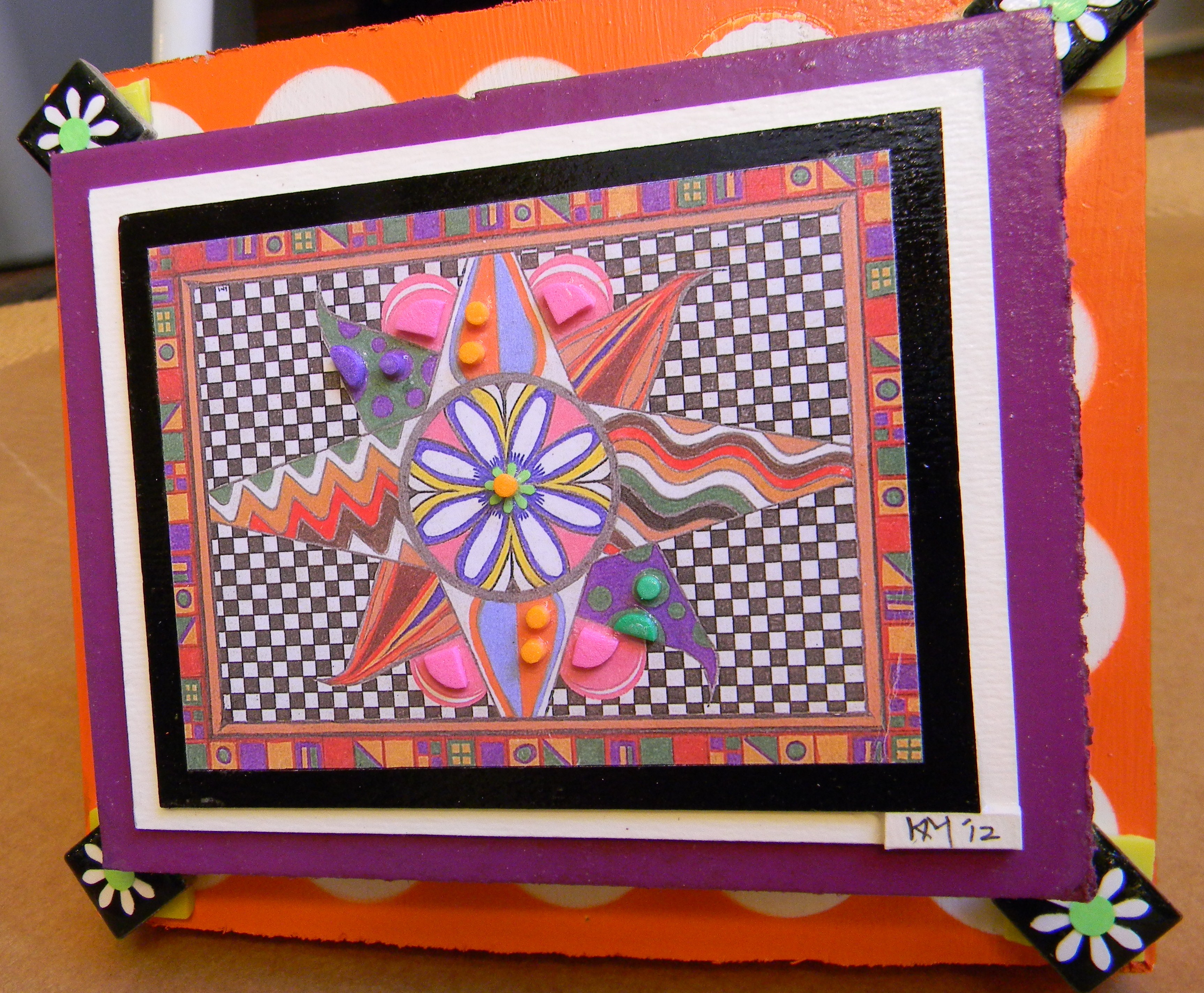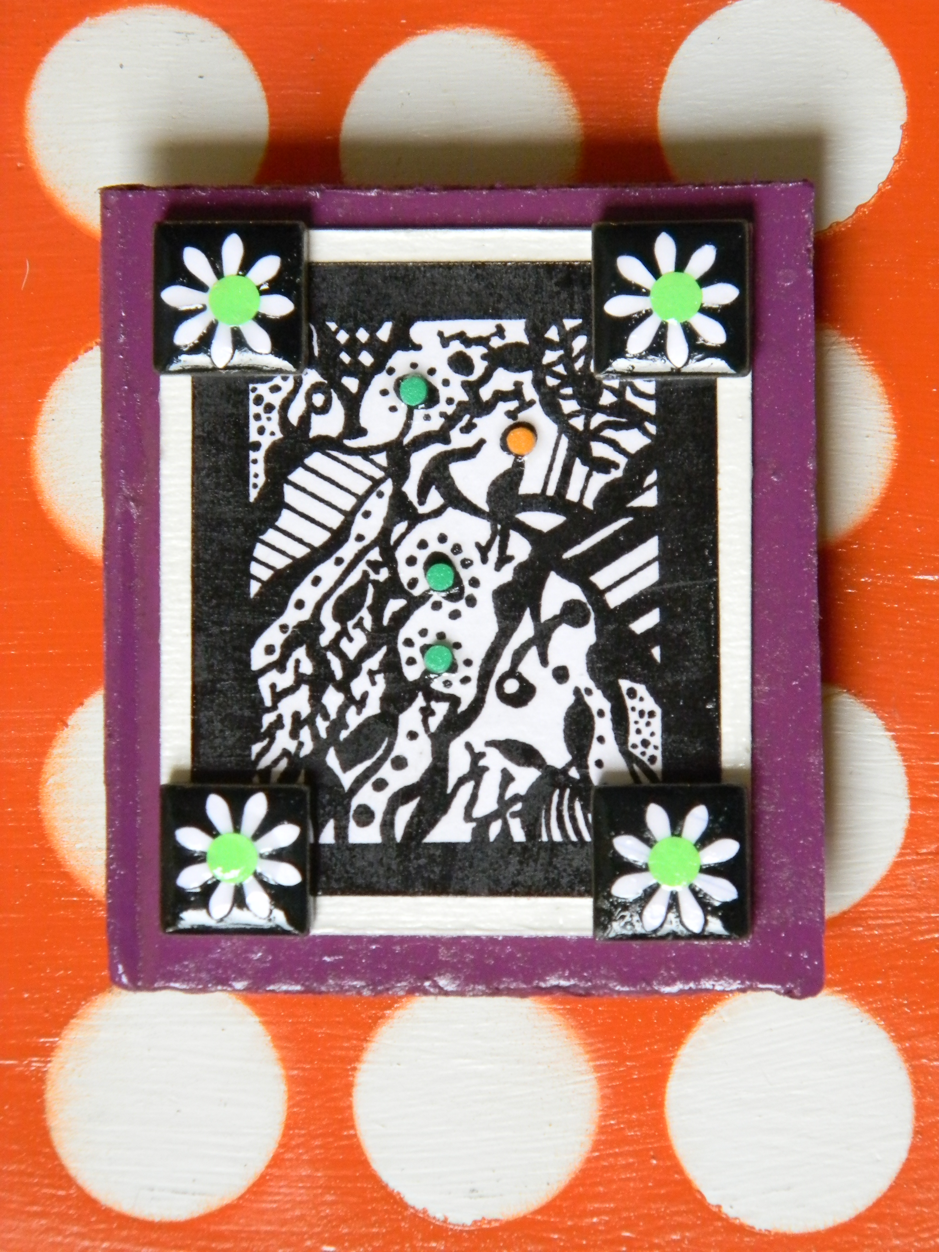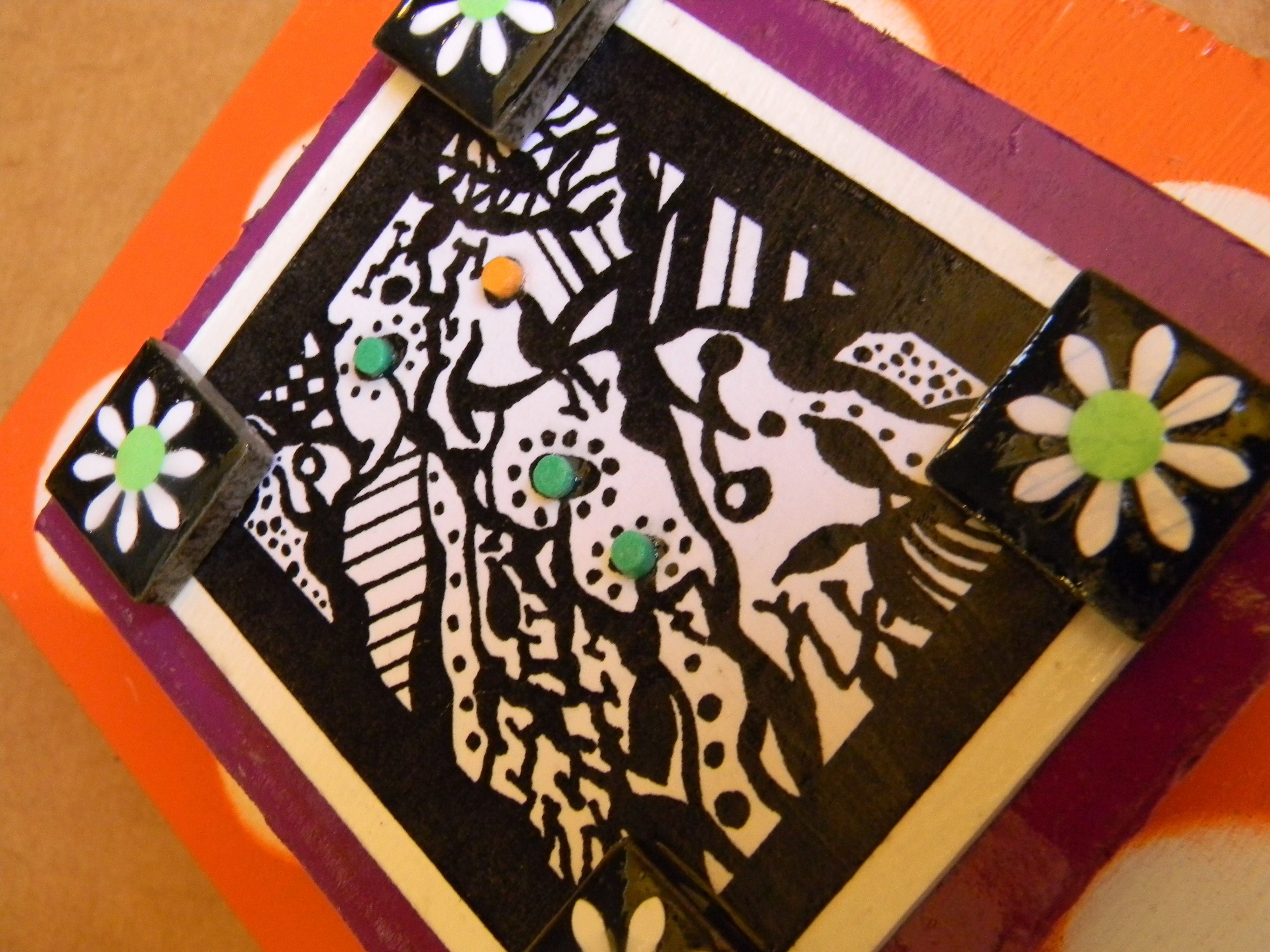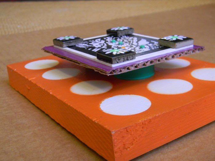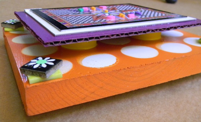 And last but not least is wall art sans cans.  These pieces incorporate prints of art I created in a one-dimensional form some years ago but reinvent here three dimensionally.  Check out how I build dimension in some pieces toward the end of this post, by mounting prints on scraps of painted cardboard and elevating them on recycled soda lids.