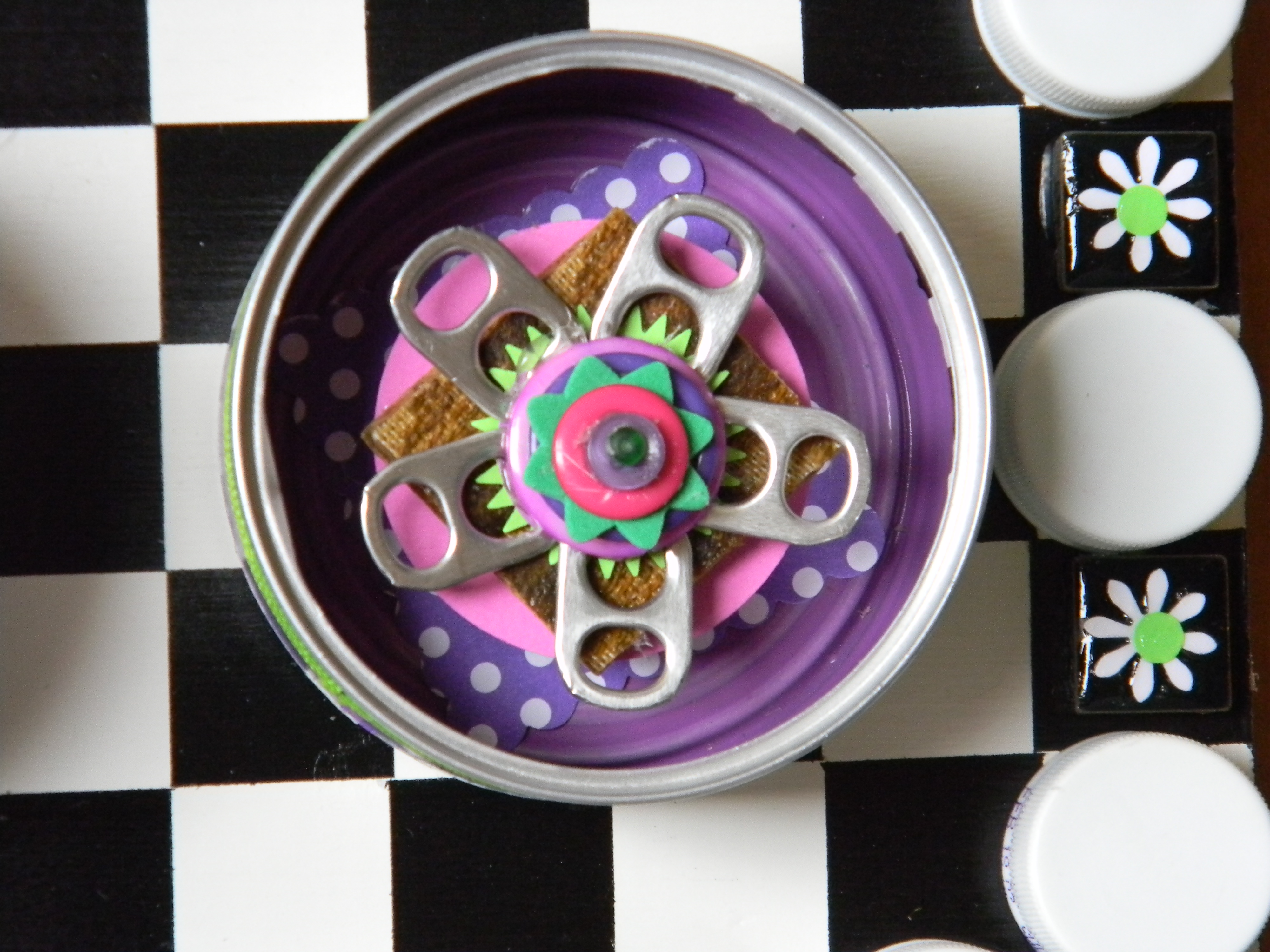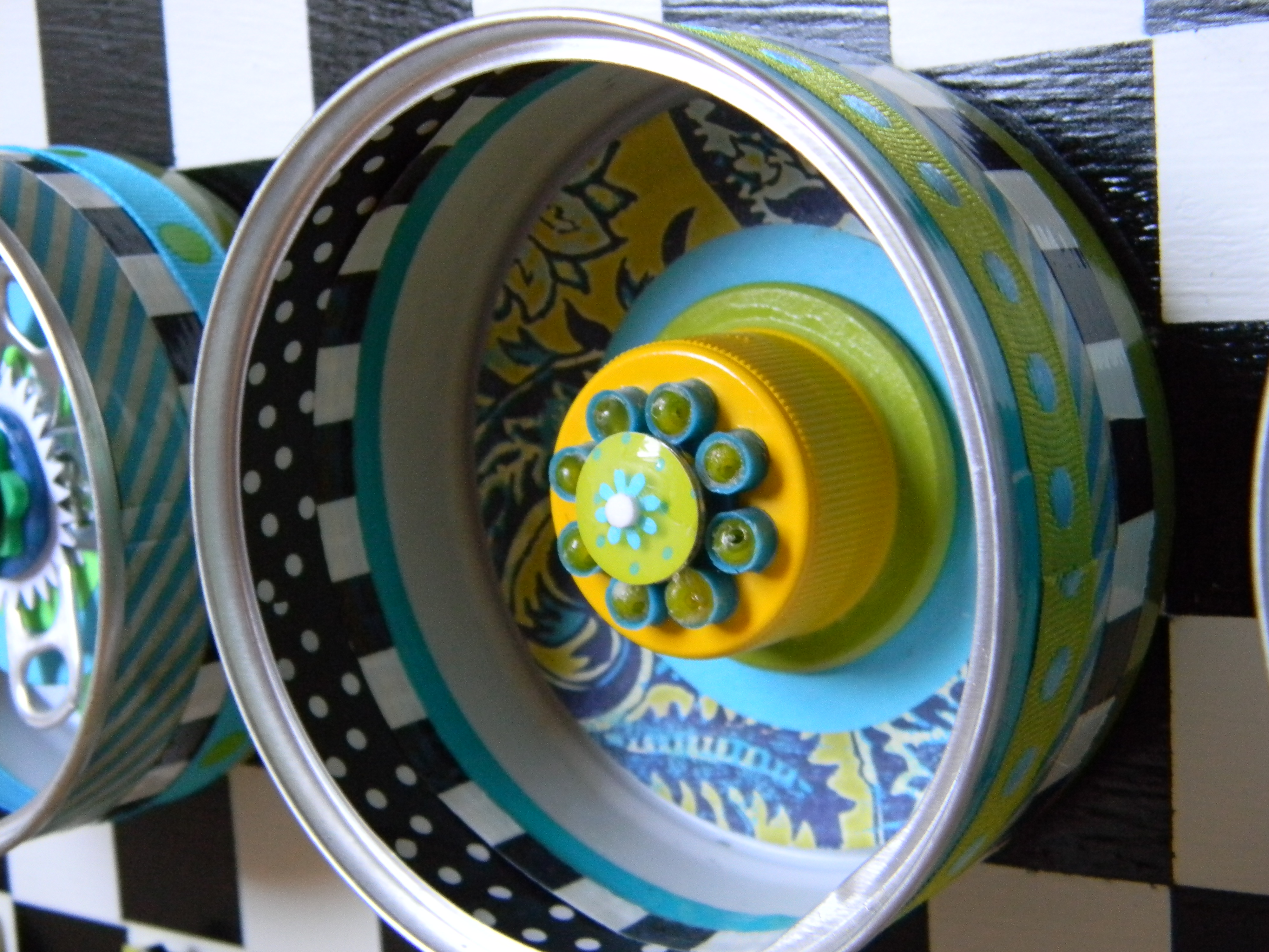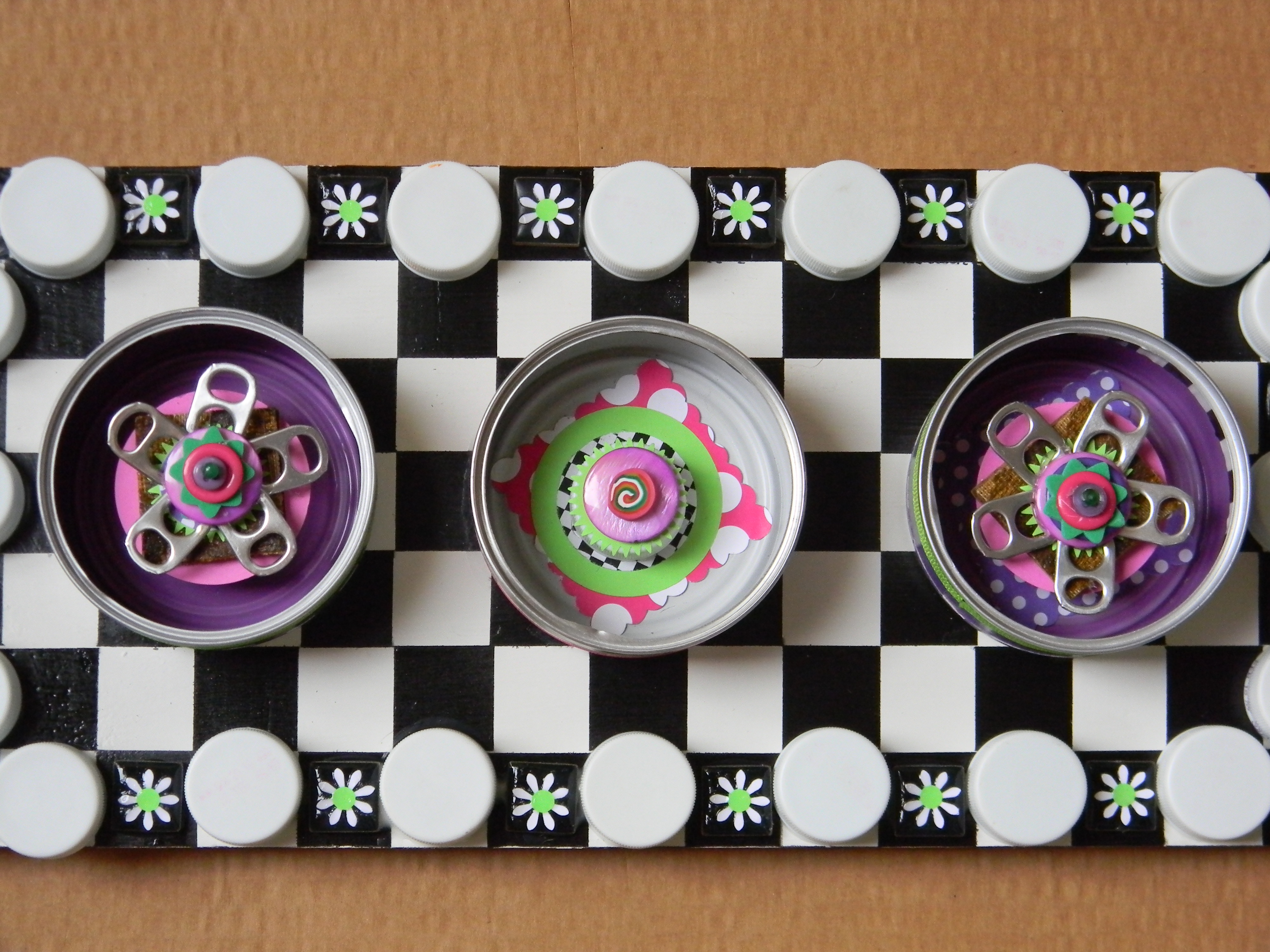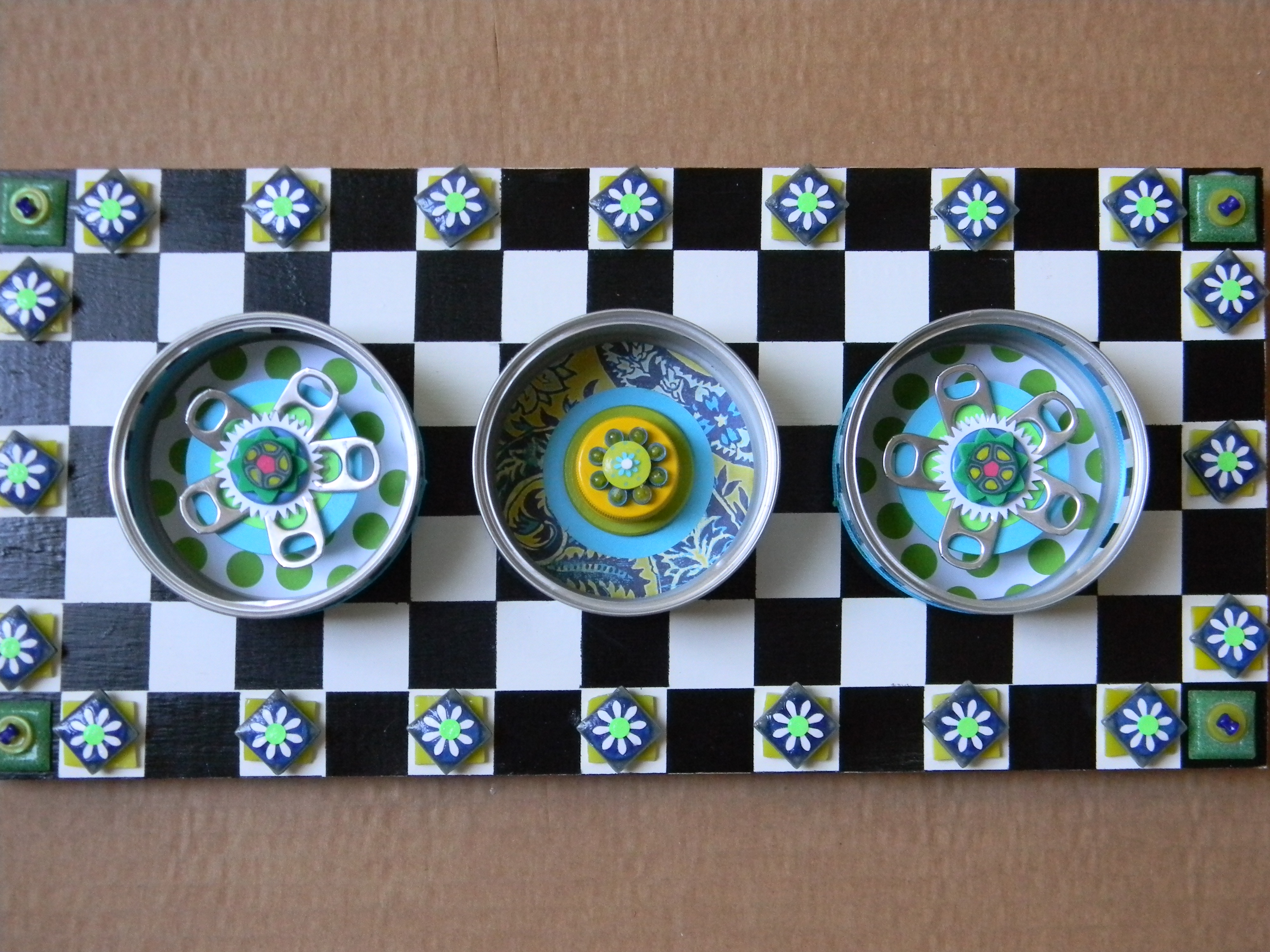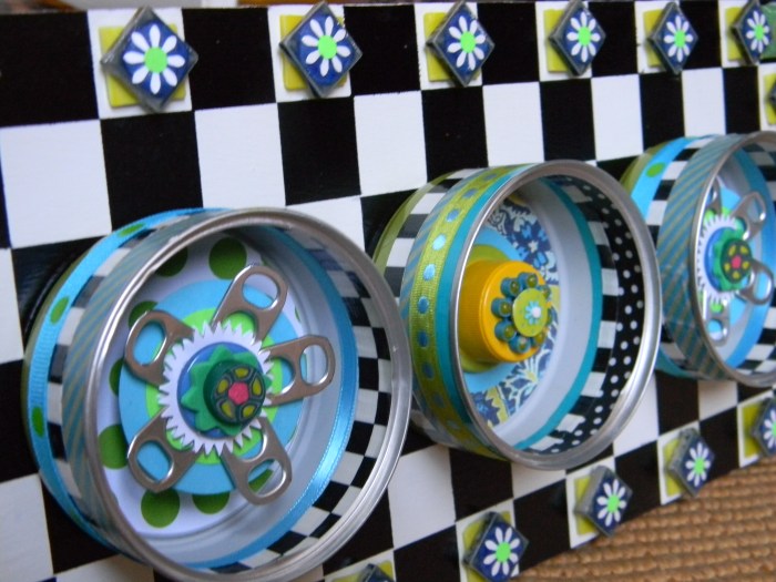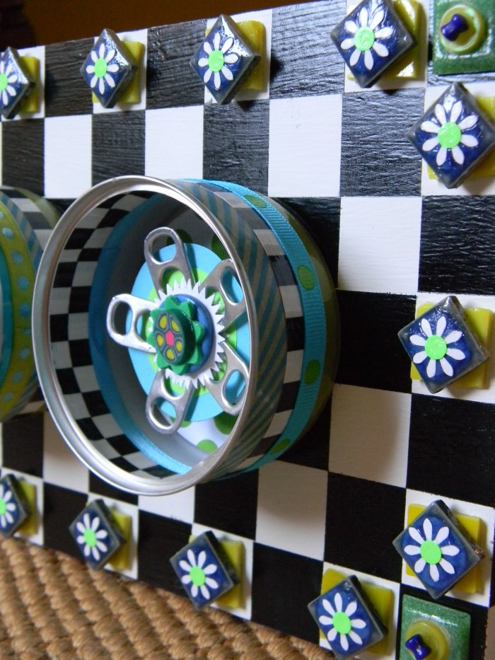 Next up is wall art made out of empty cat food cans that have been painted and mounted on scrap pieces of lumber.  Notice how I use tabs from Coke cans to create flowers and the plastic lids from two liter soda bottles to build a border.