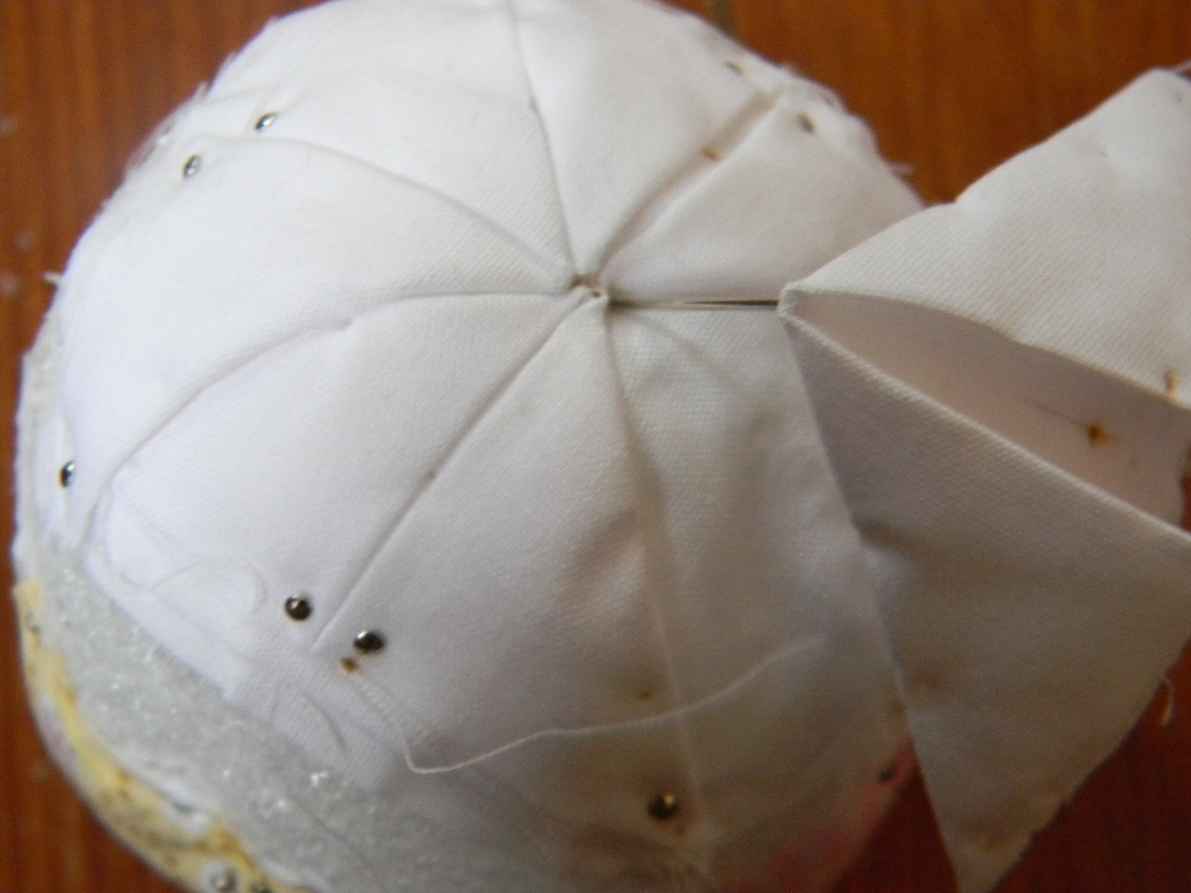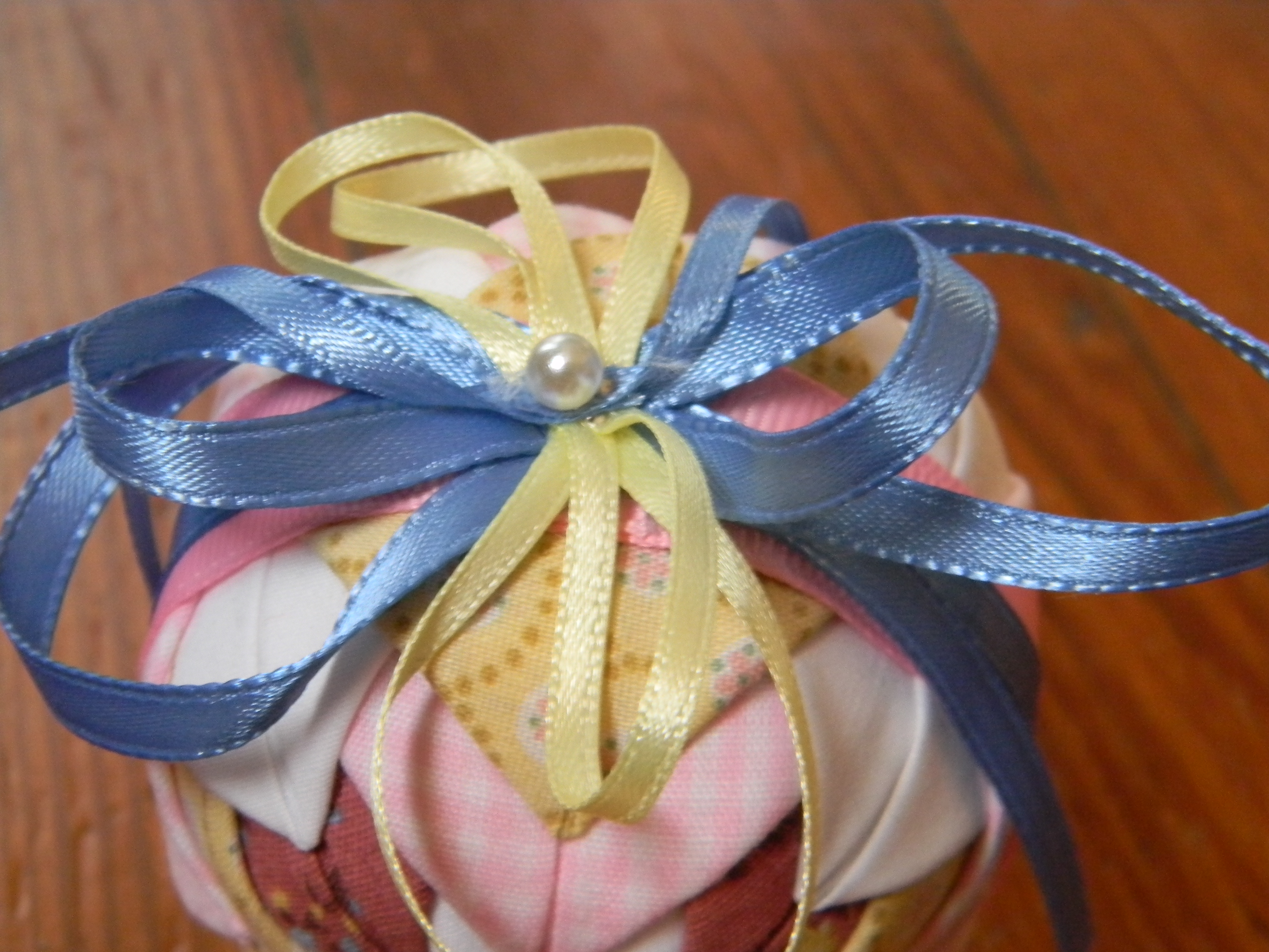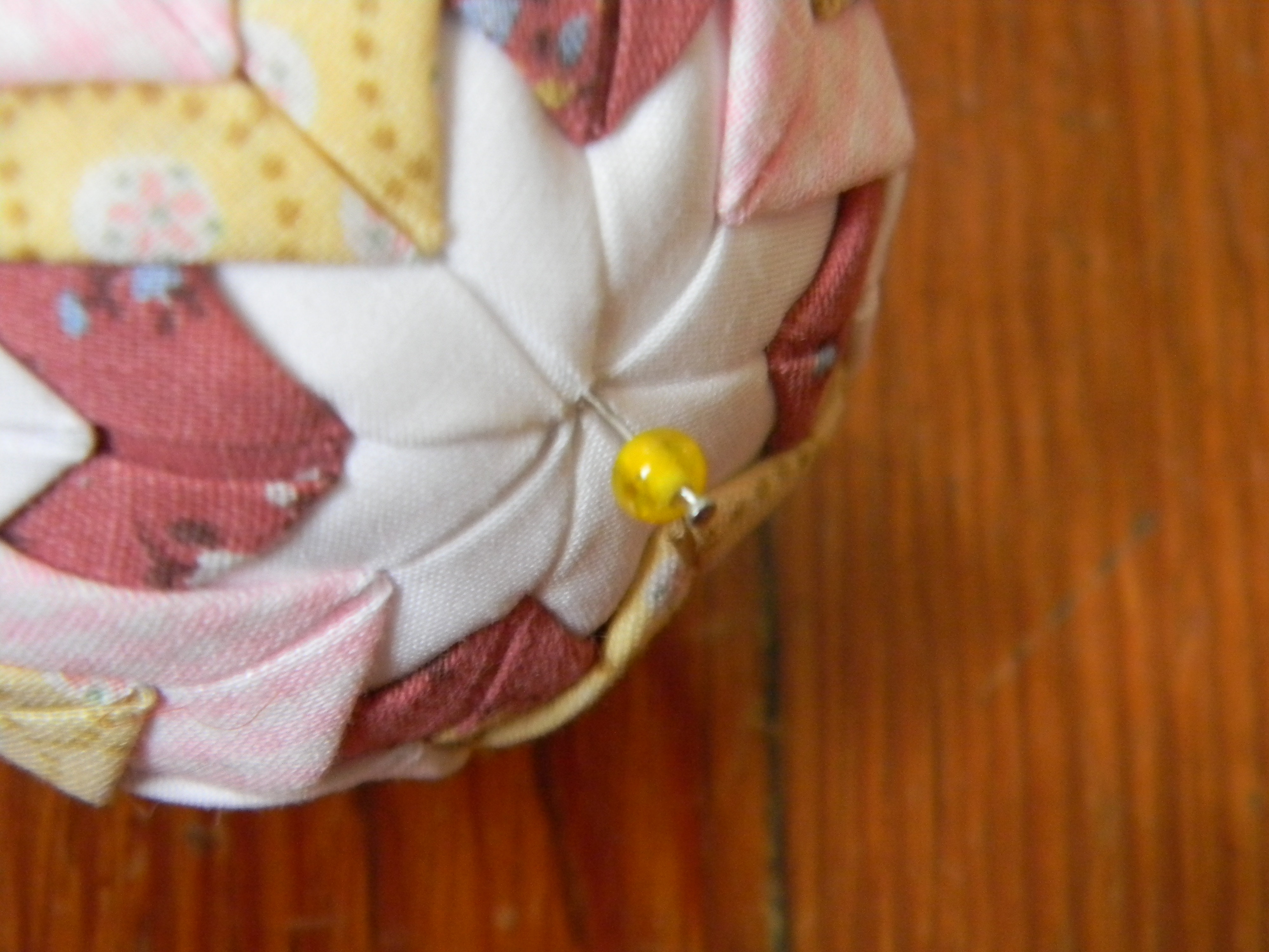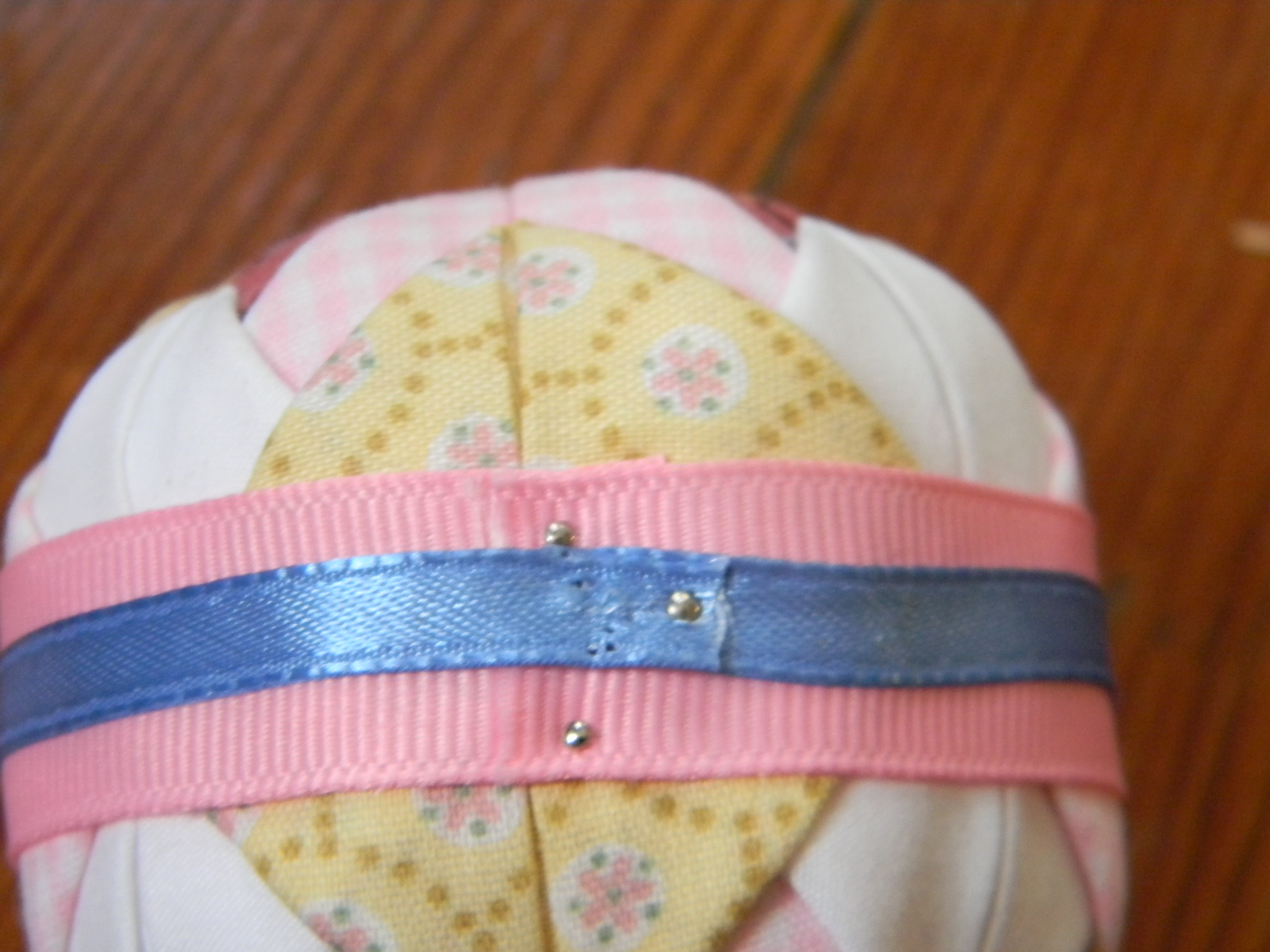 - Pin 8 inch strip of ribbon (5/8 inch wide) around the middle of the ball to cover pins.