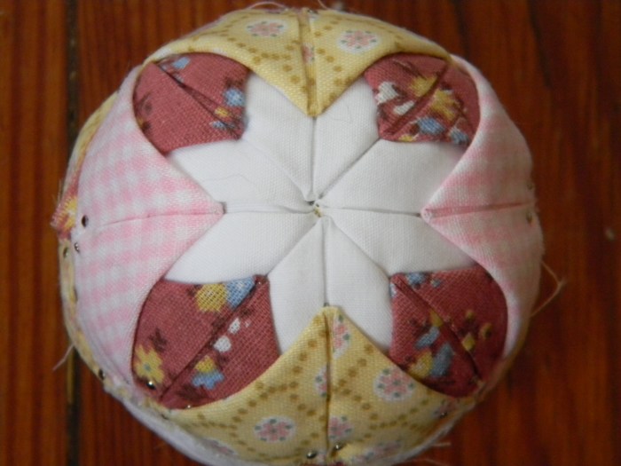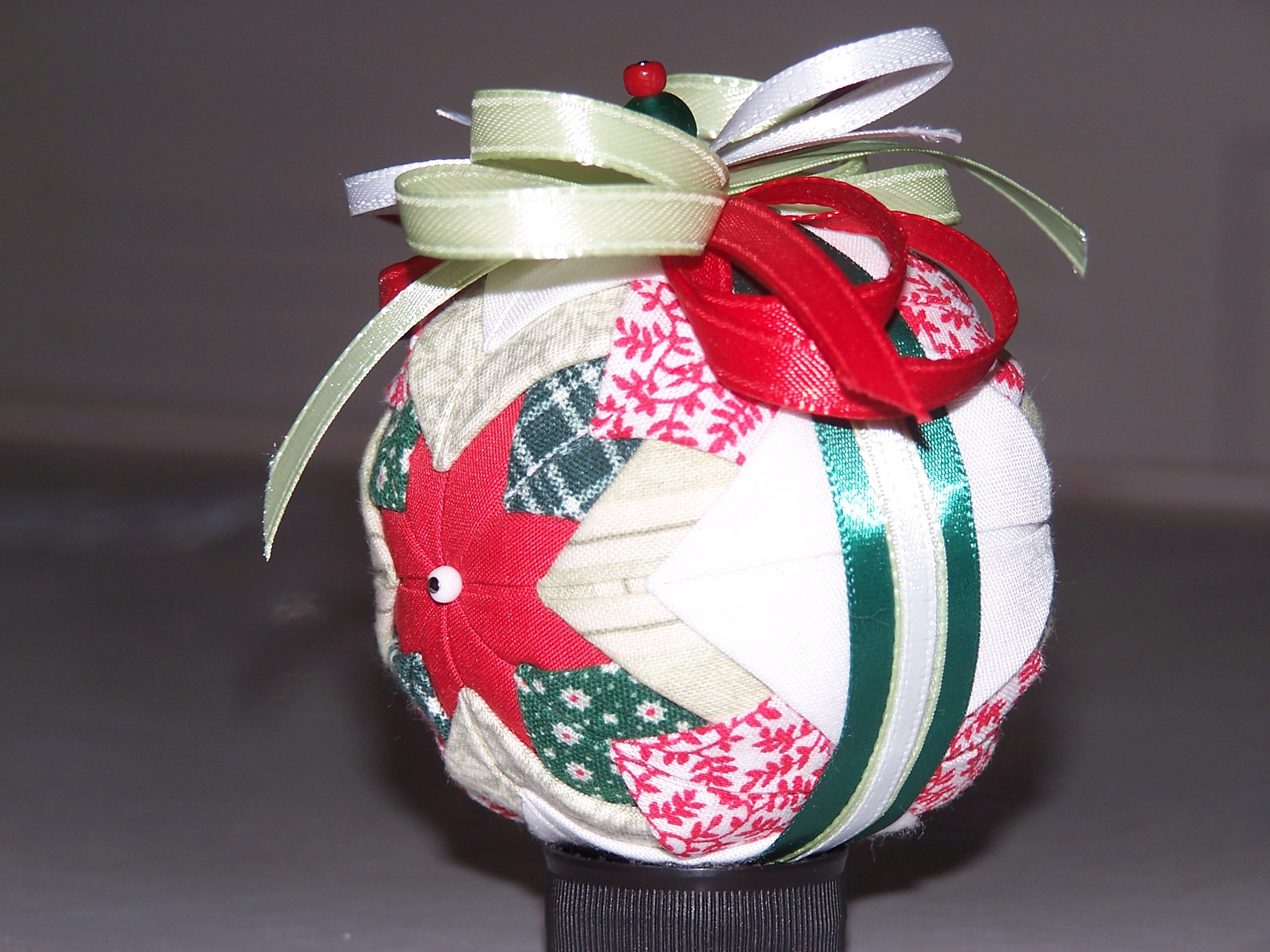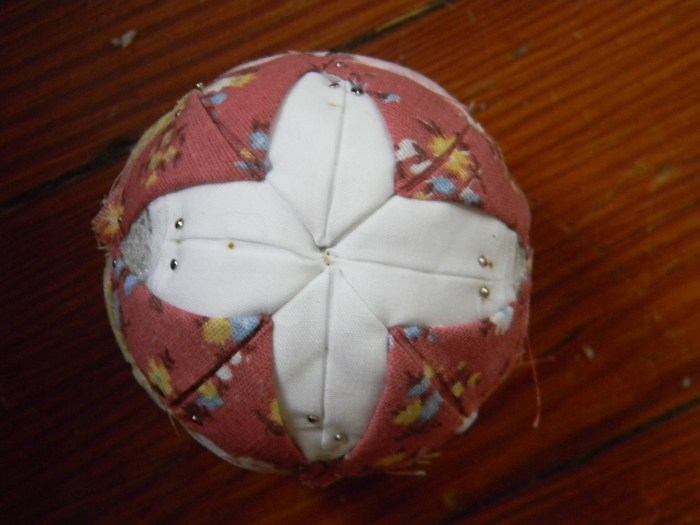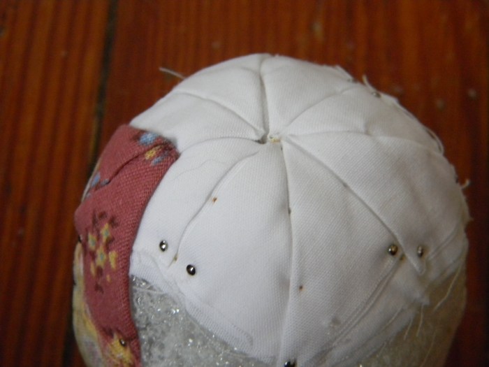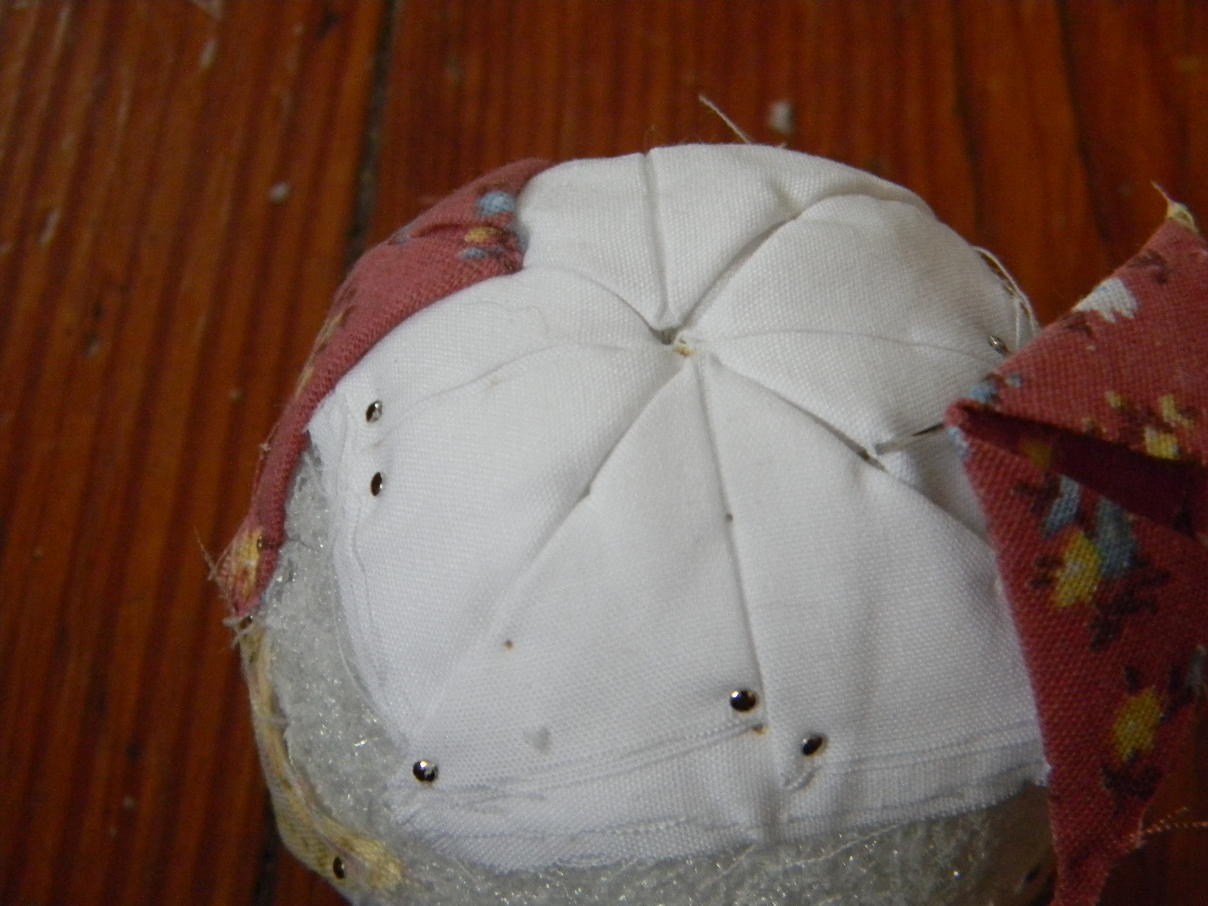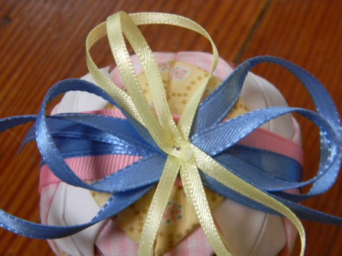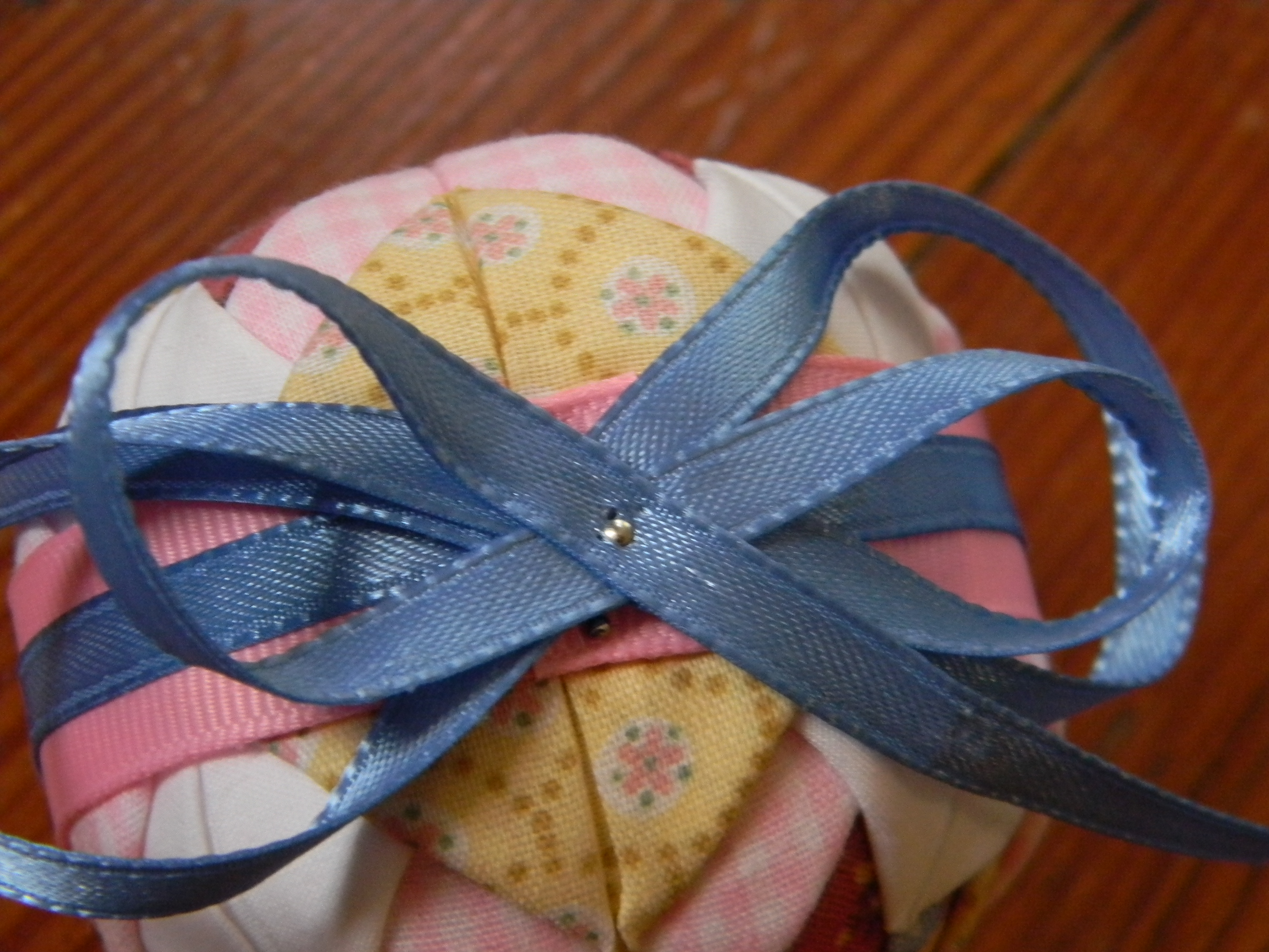 - Pin 8 inch strip of ribbon (5/8 inch wide) around the middle of the ball to cover pins.