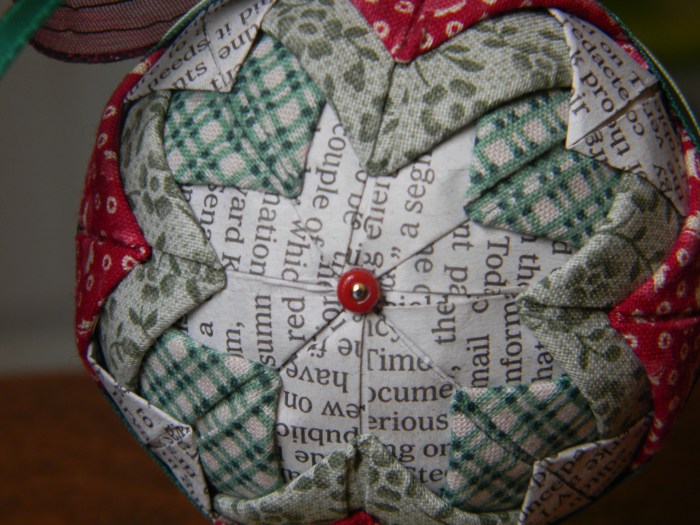 –repurposed paper from books, maps, or newspapers (40 squares per ornament, 2 inches each)
