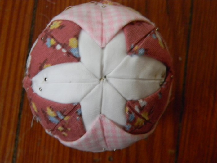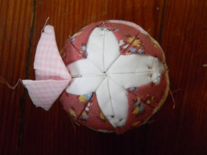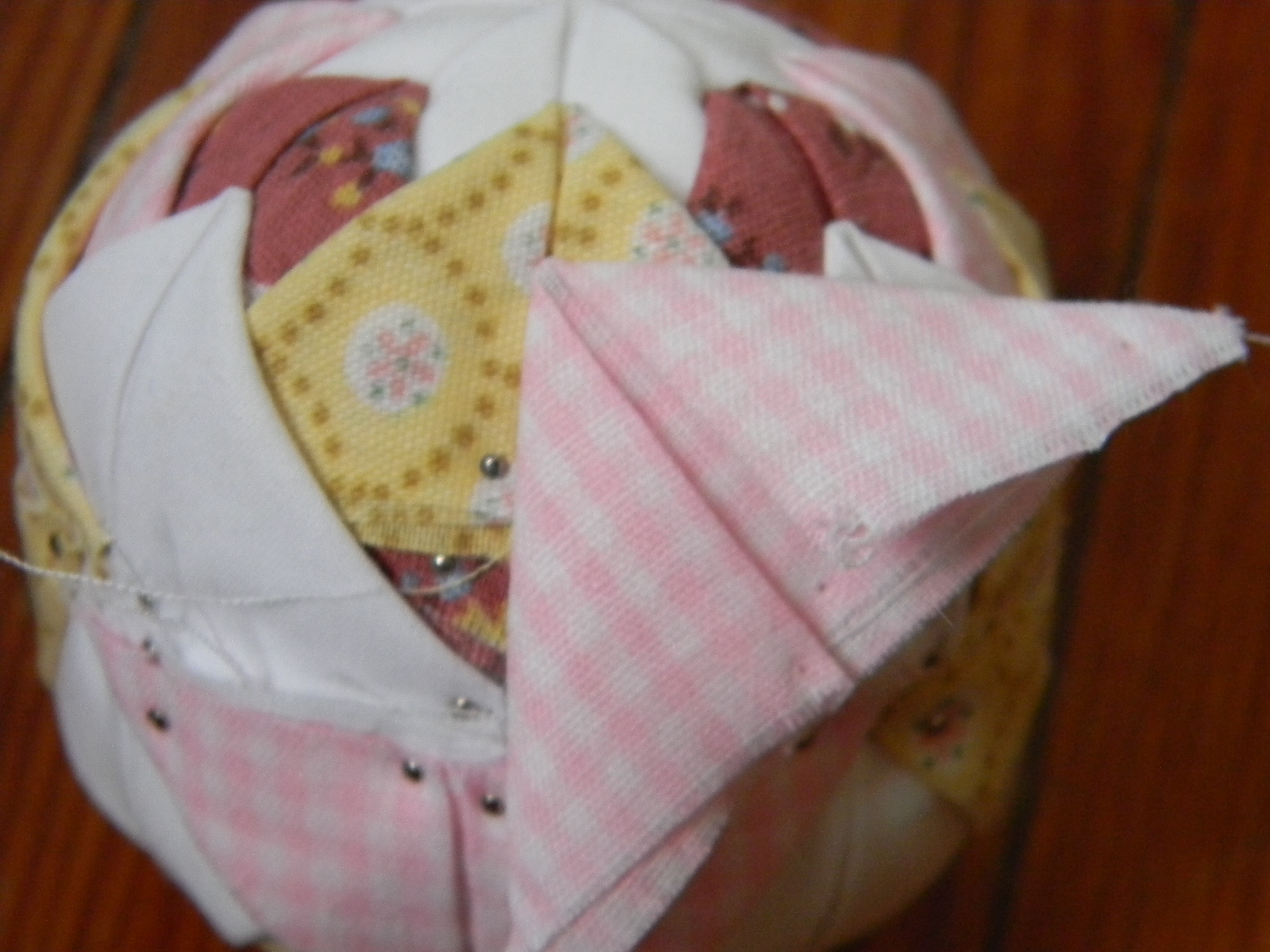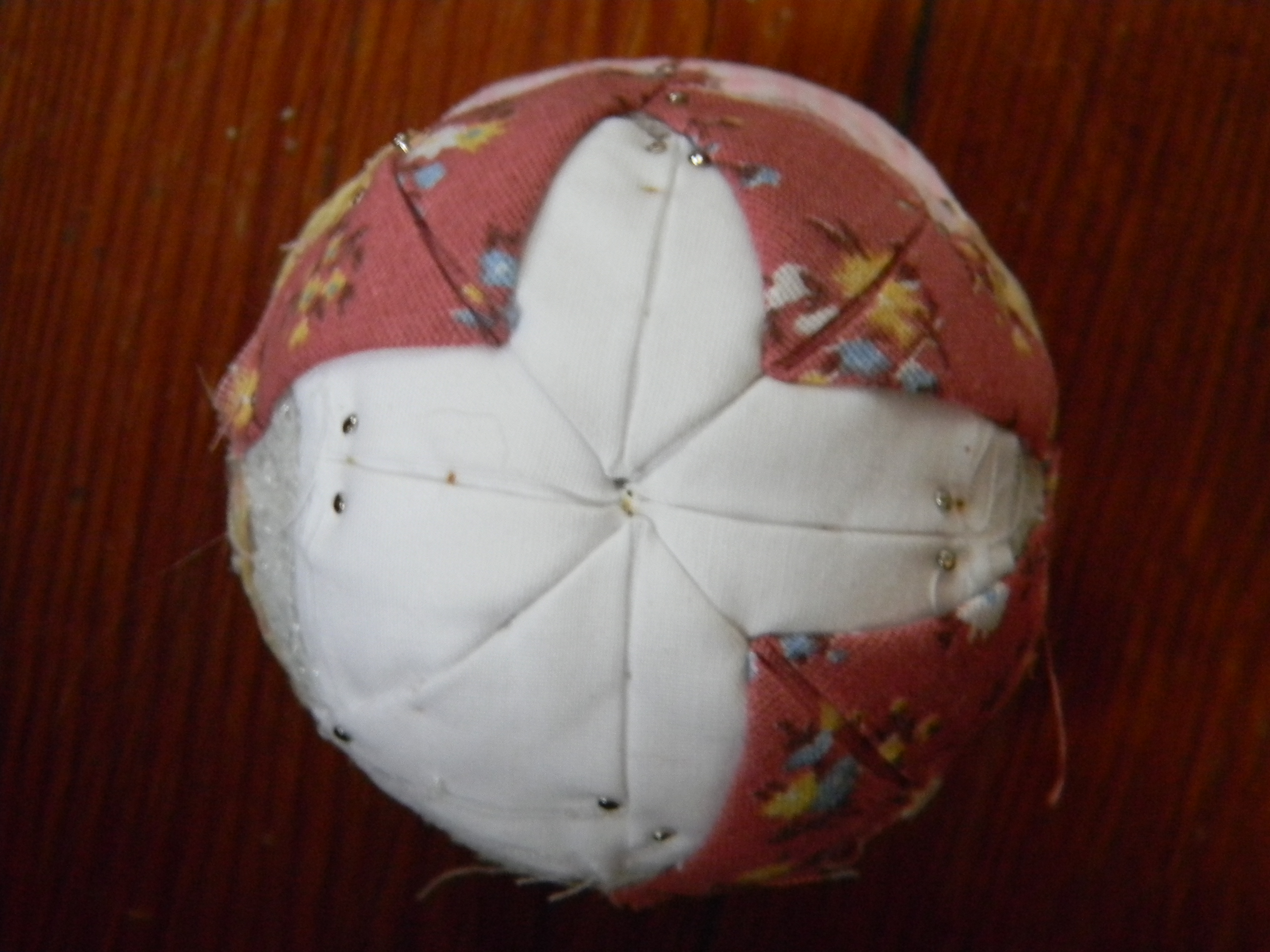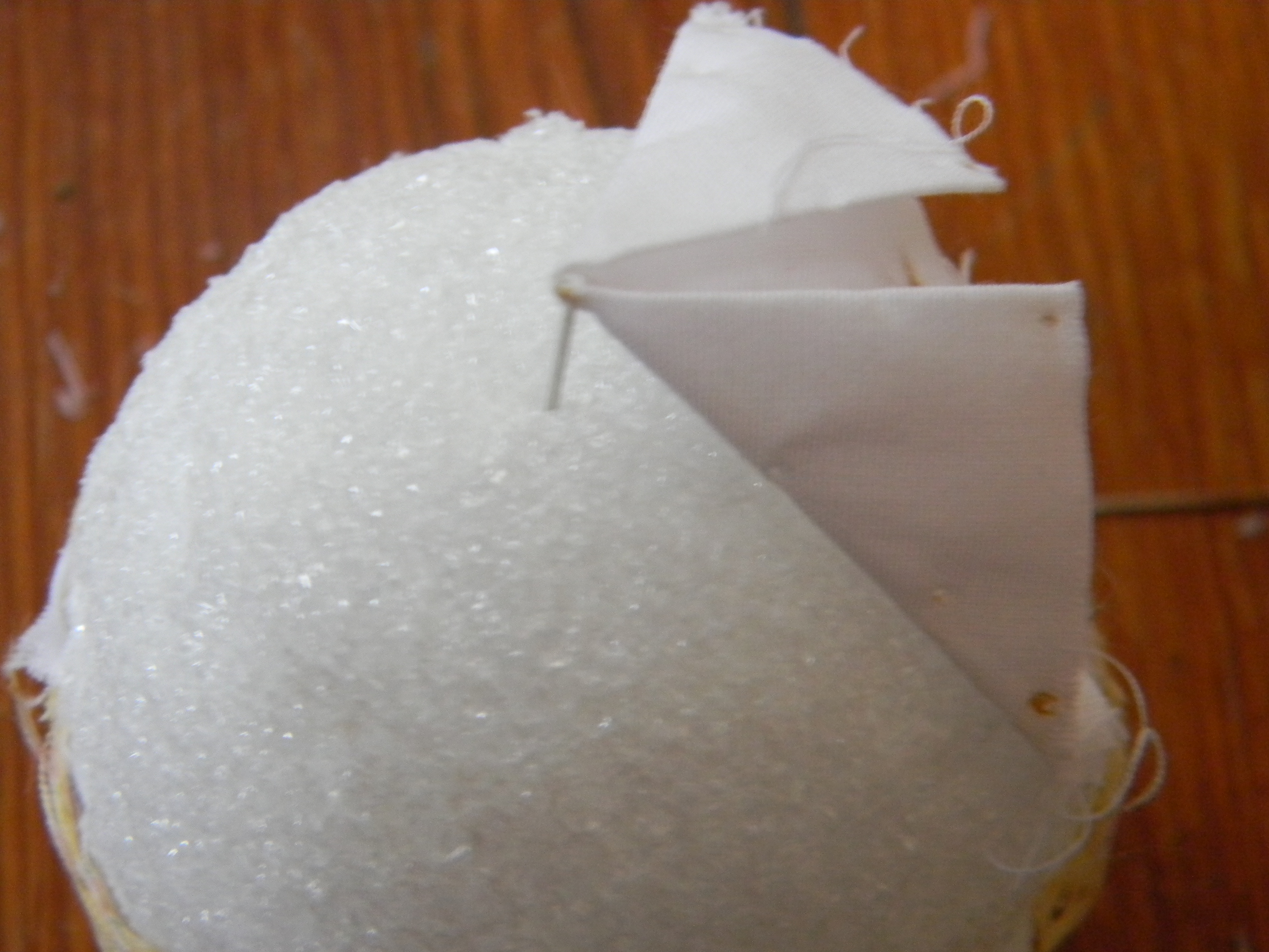 - Fold fabric/paper as shown in photos below and attach to ball.